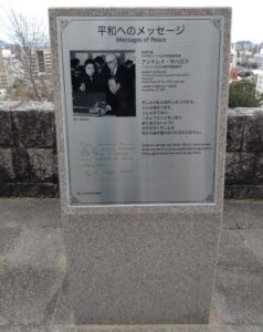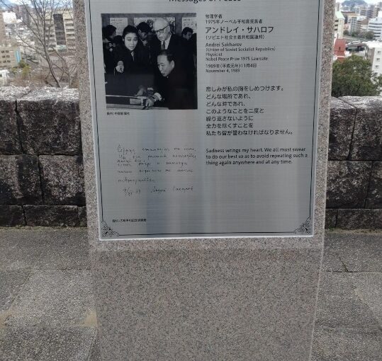 The ASF and Sakharov’s family are deeply touched by the installation of the stone monument engraved with the message of peace by Dr. Andrei Sakharov. This is a message which he personally entered in the Hiroshima Peace Memorial Museum guestbook during his visit in 1988. The stone monument was installed at the Fujimidai Observatory Deck in Hijiyama Park on March 28, 2025.